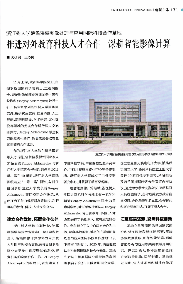 报道回顾了我校积极响应习近平总书记提出的“丝绸之路经济带”和“21世纪海上丝绸之路”的“一带一路”合作倡议,十年来与白俄罗斯高等院校、科研机构在教育、科技、人才的交流合作。将基地从与白俄罗斯国立大学的合作拓展到与白俄罗斯更多高校科研院所的合作、聚焦智能影像计算研究领域理论创新、重视应用型科技的研究和科研成果的转化等方面进行了介绍。