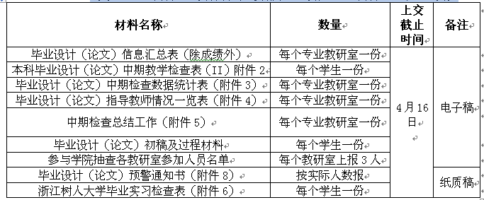 各专业教研室将学生的毕业设计(论文)初稿及过程材料及附件2、3、4、5的电子稿于4月16日(周二)前发院办李志英处。