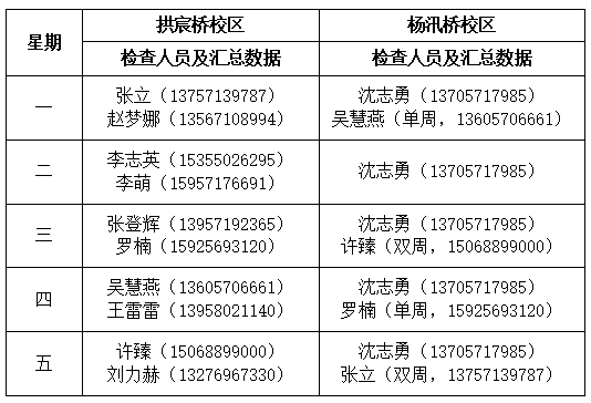 (1) 学院办公室人员负责两校区第1节、第3节课的巡查(课表见附件2),重点检查到课率、课堂秩序、课堂互动与教师规范教学等情况,并于每周五下午前将检查表(见附件3)电子稿发给罗楠。具体安排如下: