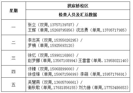 (1) 学院办公室人员负责两校区第1节、第3节课的巡查(课表见附件2),重点检查到课率、课堂秩序、课堂互动与教师规范教学等情况,并于检查当天下午16点前将检查记录表(见附件3)电子稿发给罗楠。具体安排如下: