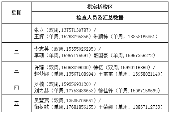 (1) 学院办公室人员负责第1节、第3节课的巡查(课表见附件2),重点检查到课率、课堂秩序、课堂互动与教师规范教学等情况,并于检查当天下午16点前将检查记录表(见附件3)电子稿发给罗楠。具体安排如下: