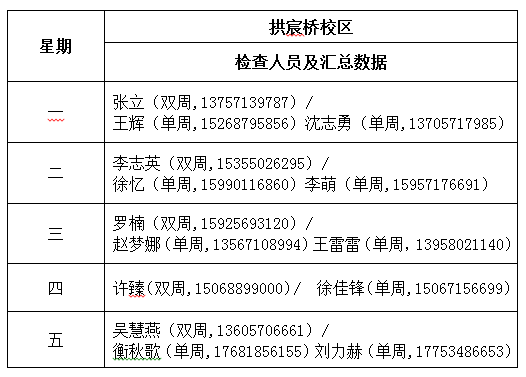 (1) 学院办公室人员负责两校区第1节、第3节课的巡查(课表见附件2),重点检查到课率、课堂秩序、课堂互动与教师规范教学等情况,并于检查当天下午16点前将检查记录表(见附件3)电子稿发给罗楠。具体安排如下: