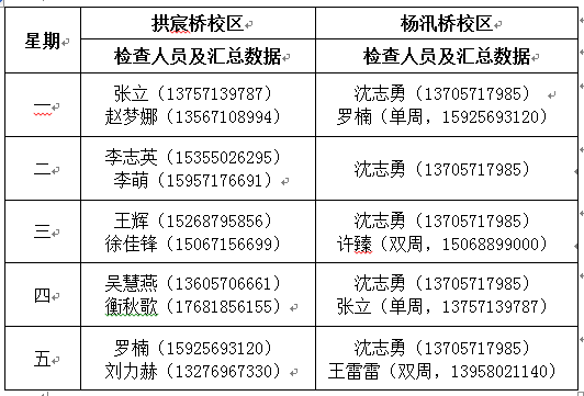 (1) 学院办公室人员负责两校区第1节、第3节课的巡查(课表见附件2),重点检查到课率、课堂秩序、课堂互动与教师规范教学等情况,并于检查当天下午16点前将检查汇总表(见附件3)电子稿发给罗楠。具体安排如下:
