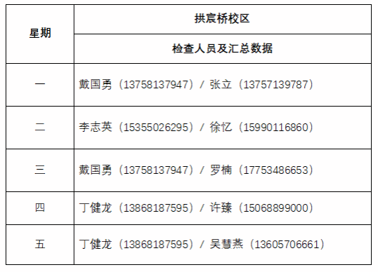 (1) 学院办公室人员负责第1节、第3节课的巡查(课表见附件2),重点检查到课率、课堂秩序、课堂互动与教师规范教学等情况,并于检查当天下午16点前将检查记录表(见附件3)电子稿发给罗楠。具体安排如下: