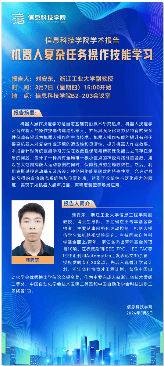 3月7日(星期四)下午15:00,学院在B2-203会议室举办“机器人复杂任务操作技能学习”学术报告,请没有课的老师积极参加。
