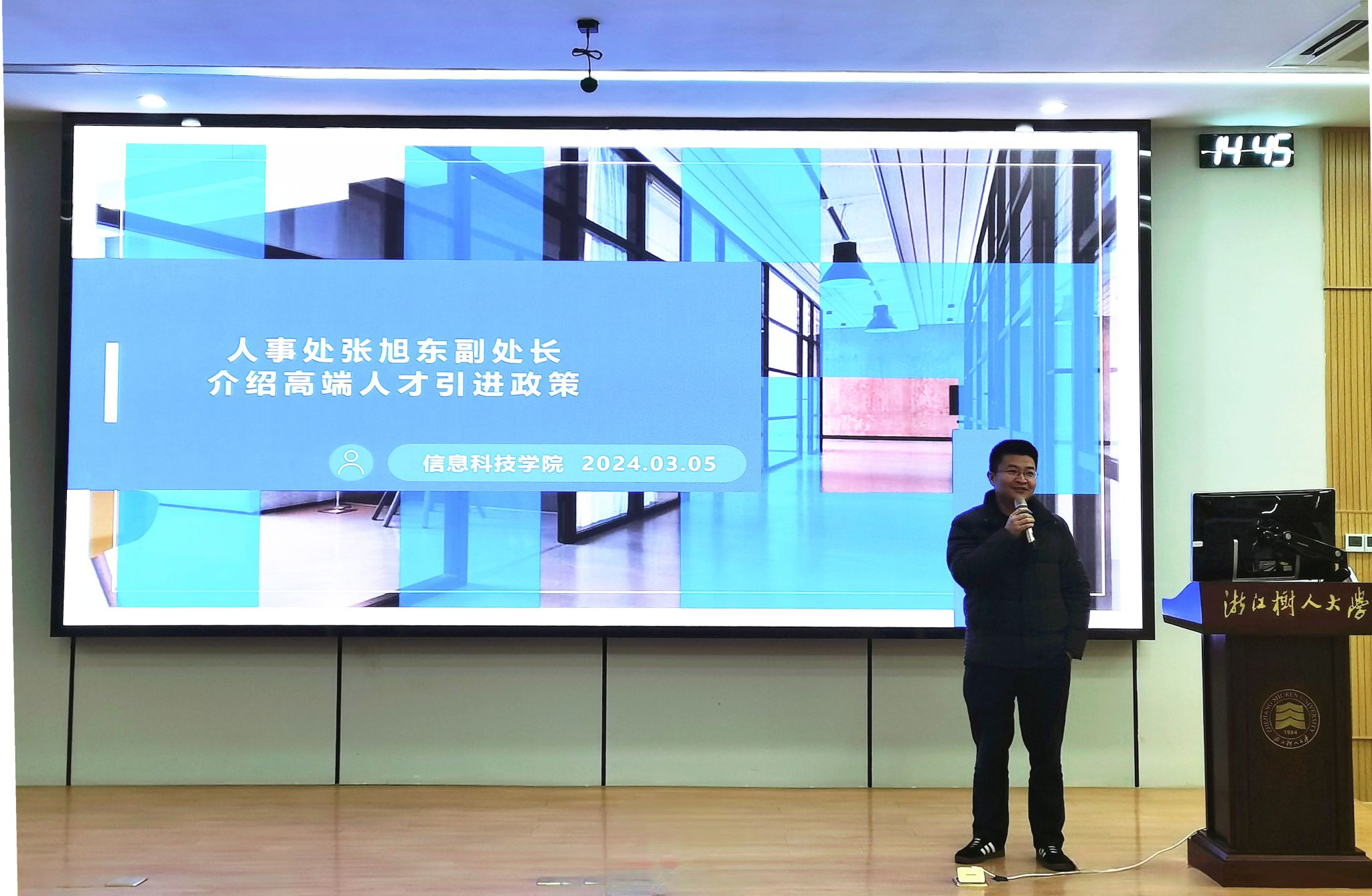 接着,人事处张旭东副处长介绍了高端人才引进政策。满满一会议室的教师,让张处既倍感亲切又倍感欣慰,表明学院师资队伍的壮大,人才引进工作卓有成效。他介绍了海外引才项目、长江讲席学者及学校高层次人才引进的政策,分析了近年来我校及信息学院师资队伍现状、职称年龄结构、师资队伍情况。希望大家群策群力,集思广益,发动多方力量,做好人才推荐引进工作,助推学院高质量发展。