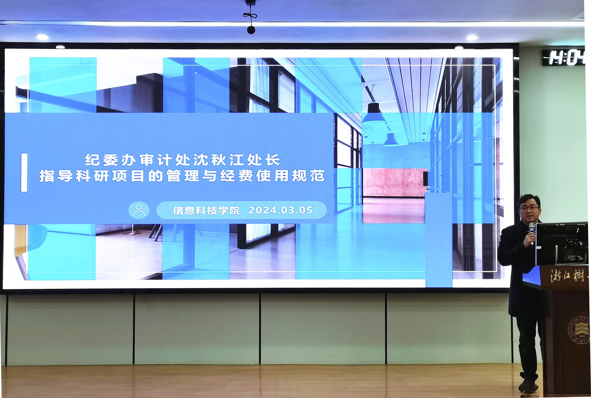 首先,纪委办审计处沈秋江处长就师德师风建设、科研项目的管理与经费使用规范进行指导。他以案例的形式,要求全院教师强化师德师风意识,加强师德师风建设,要牢记 “树人为本”校训,提高“师德师风”素养。他以近年来科研经费的专项审计、日常审计和信访为例,从干部的健康成长、教师发展的角度,给出了科研项目管理与经费使用的指导与警示,并给出三点要求:一是正确理解和认识到校科研经费的公立属性;二是认识学习科研经费使用规范,牢固树立底线意识;三是坚持科研经费使用的相关性、合理性、合规性原则。