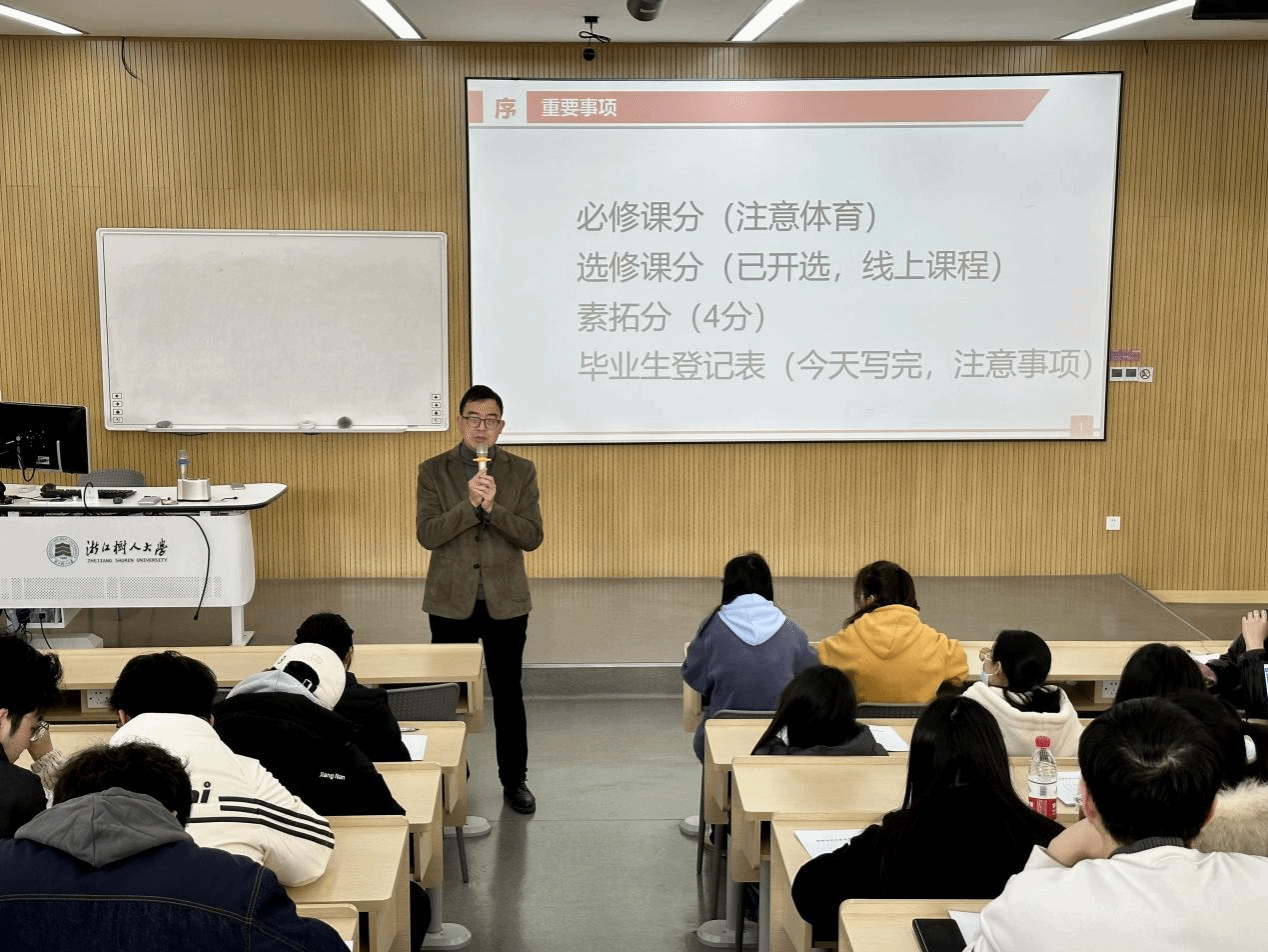 会议第二阶段,学院副书记丁健龙及毕业班辅导员向毕业生们介绍毕业注意事项、就业方案上报流程,对就业奖励相关制度和文件进行详细解读,同时强调在毕业环节人事档案、党团组织关系转接事宜的重要性,为毕业生顺利毕业、顺利就业提供充分支持和指导。