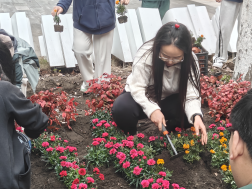 在植树板块,师生个个热情洋溢、干劲十足,以饱满的热情投入到播种绿色的植树行动中。大家扛着工具和树苗,来到指定种植区域,在经验丰富的林业绿化工作人员耐心地指导下,师生挖坑种苗、铲土培实、提桶施肥,两人成对、三人成组,各自分工协作每道工序都认真细致、一丝不苟。通过大家的努力,一点一滴构筑了“40”这个图案,为四十周年校庆增添了一抹靓丽的色彩。