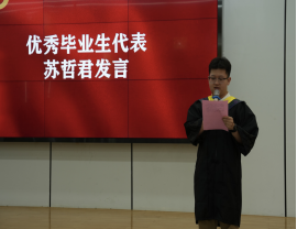 毕业生代表苏哲君同学在发言中表达了对学院的感激之情,感谢学院提供的优质教育资源和老师们的悉心教导。他们表示,学院的学习经历不仅让他们掌握了专业知识,更培养了他们解决问题的能力和团队协作的精神。毕业生们承诺,将带着学院的期望和祝福,勇敢地迈向人生的新阶段。