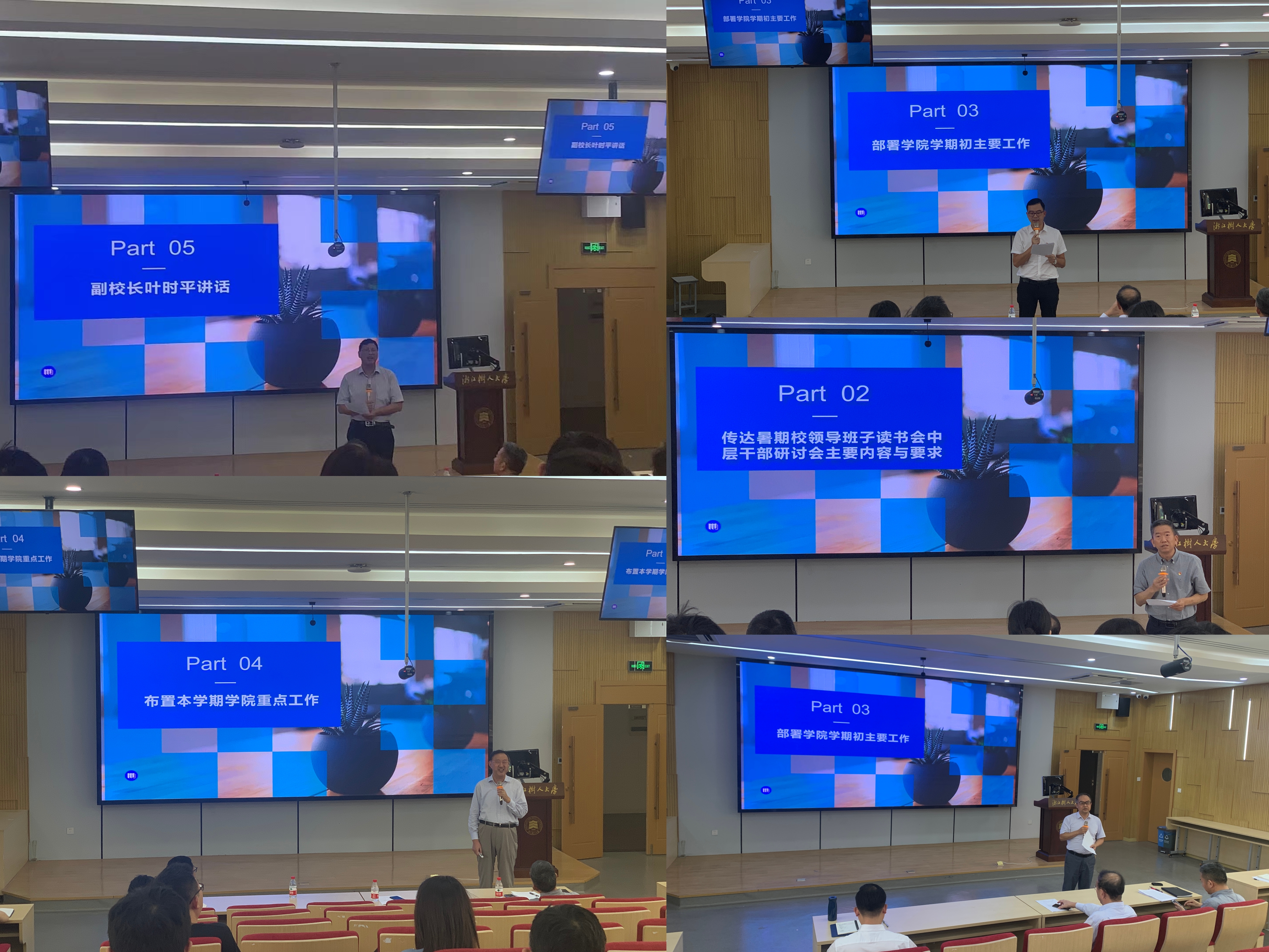 王万良院长从“十四五”省一流学科申报、“医工信”研究院建设,电子信息硕建点PI团队遴选成立、人事人才工作、科研与社会调研工作、疫情防控、学科竞赛、招生录取等方面回顾了暑期主要工作。从提升党建工作质量推动学院稳步发展,突显学科特色强化学科科研,提高人才培养质量推进应用型人才培育,落实立德树人根本任务全面提升学生管理水平,优化制度机制提升总体管理水平等方面部署了本学期重点工作。他强调,2022年是党的二十大召开之年,是“十四五”规划实施的关键之年,也是学校申硕的关键之年。全院教职员工要围绕电子信息专业硕士学位点建设行动方案、省“十四五”一流学科建设,齐心协力推动学院持续快速健康发展。他希望全体教职员工要快乐的工作,在工作中找到成就感和使命感。2023年申硕已进入倒计时,我们要凝心聚力,全力投入这场生死决战。