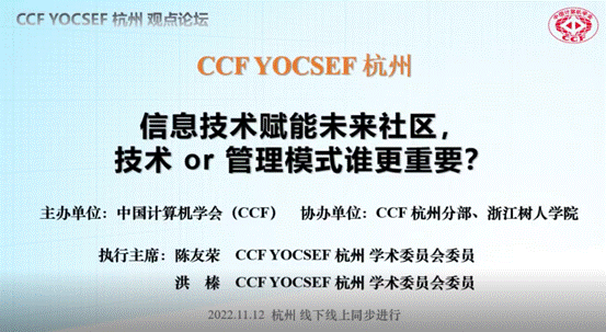 11月12日,“中国计算机学会青年科技论坛(CCF Young Computer Scientists & Engineers Forum,CCF YOCSEF)杭州”与伟德BETVLCTOR1946联合举办“信息技术赋能未来社区,技术or管理模式谁更重要?”观点论坛,就“信息技术赋能未来社区,技术or管理模式谁更重要”话题展开讨论和思辨。一百余名高校和企业的专家、学者以线上或线下方式参加了本次论坛,我校副校长叶时平作为引导嘉宾进行引导发言,伟德BETVLCTOR1946党委书记兼常务副院长王章权、副院长张登辉全程参加本次活动,CCF YOCSEF杭州分论坛AC委员陈友荣教授与浙江工业大学洪榛教授作为执行主席联合主持本次论坛。