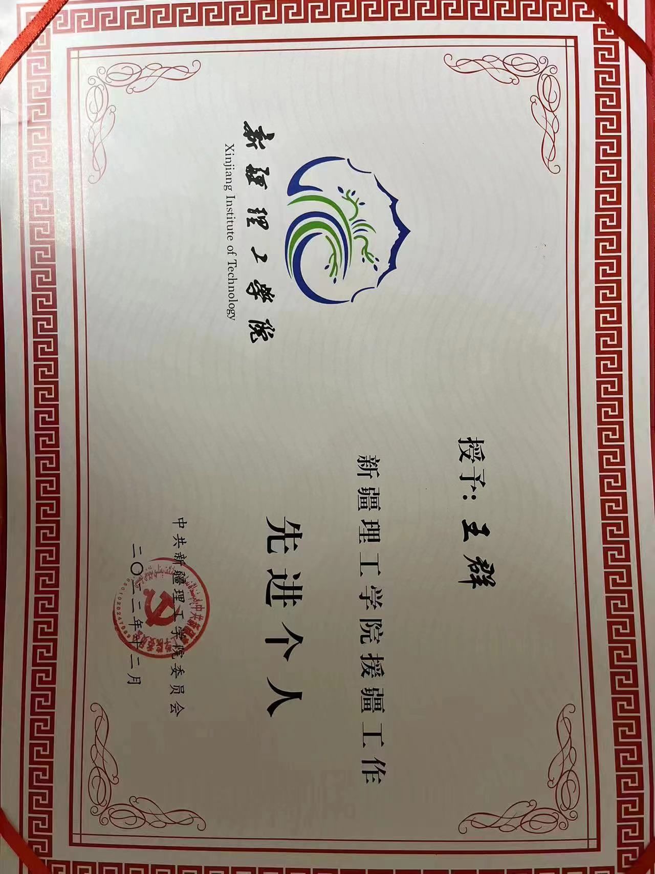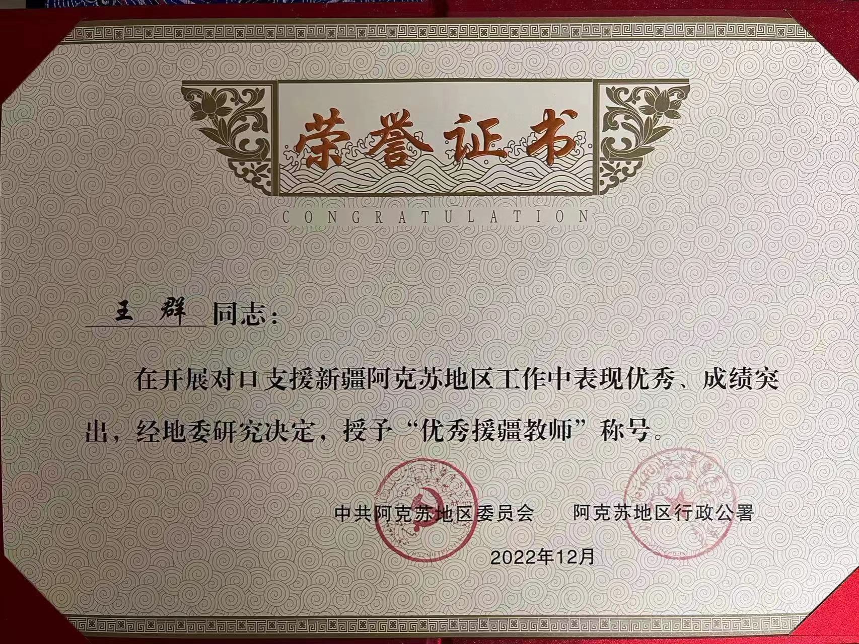 绩:援疆期间,王群在新疆理工学院学年考核优秀;获新疆理工学院援疆工作“先进个人”;获中共阿克苏地区委员会颁发的“优秀援疆教师”称号。