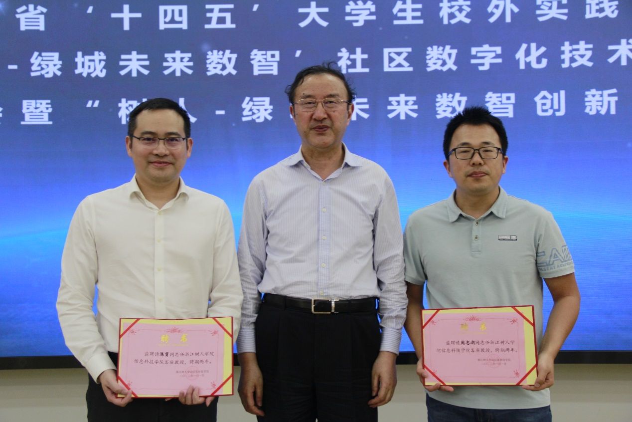 随后进行了“树人-绿城未来数智”社区数字化技术应用实践教育基地的授牌仪式,王万良向陈霄,周志湖颁发了客座教授证书。