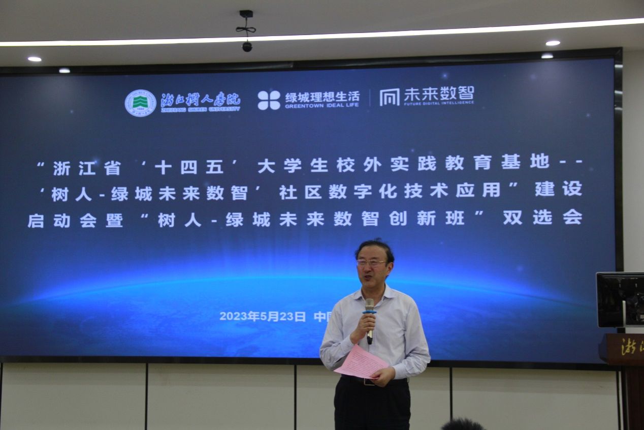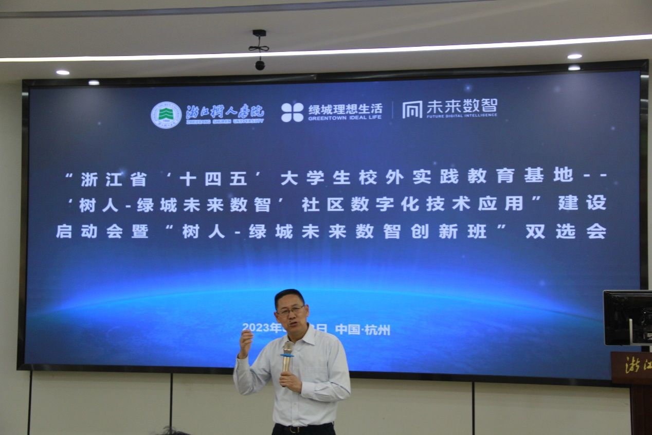 会议第一阶段,陈新民首先对绿城数智集团陈霄一行的到来表示欢迎,并解读了数字化社区建设相关政策,对“树人-绿城未来数智”社区数字化技术应用实践教育基地的整体目标与建设进程提出了明确的要求,他认为将未来社区建设与人才培养相结合是一次大胆的创新与尝试,有利于推动产学合作人才培养模式的创新,他也对创新班的学子提出了殷切的期望,希望同学们学有所获,更好走向社会。