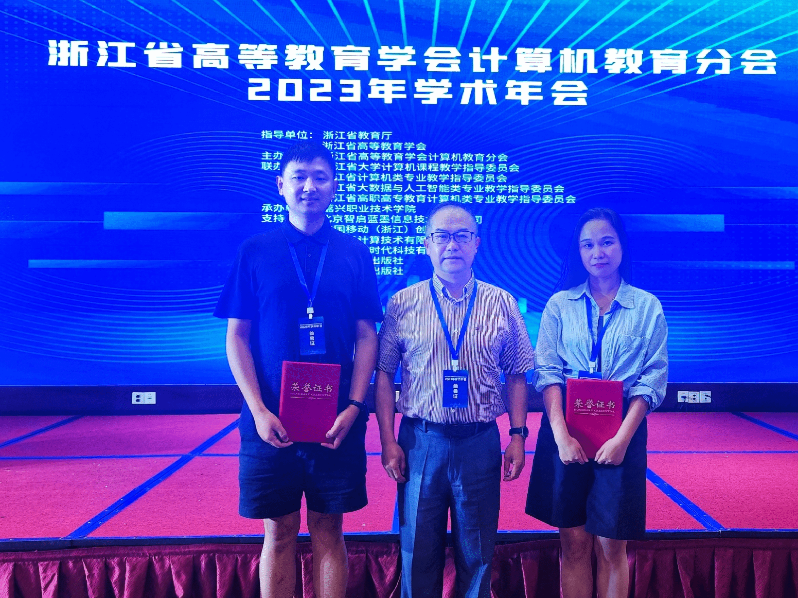 近日,浙江省高等教育学会计算机教育分会2023年学术年会在嘉兴召开,我院张登辉副院长、计算机科学与技术教研室戴国勇、数据科学与大数据技术教研室石声波参加会议。本次年会由浙江省教育厅、浙江省高等教育学会指导,浙江省高等教育学会计算机教育分会、浙江省高校计算机类专业教学指导委员会主办,嘉兴职业技术学院互联网学院、网络空间安全学院承办。本次年会的主题是 围绕新时期国家高等教育人才培养新模式、新结构、新质量,研讨我 省高校计算机教育教学的改革与创新。会议邀请了中南大学陈志刚教授、北京理工大学嵩天教授、湖州师范学院胡文军教授等省内外计算机教育领域专家做特邀主题报告。