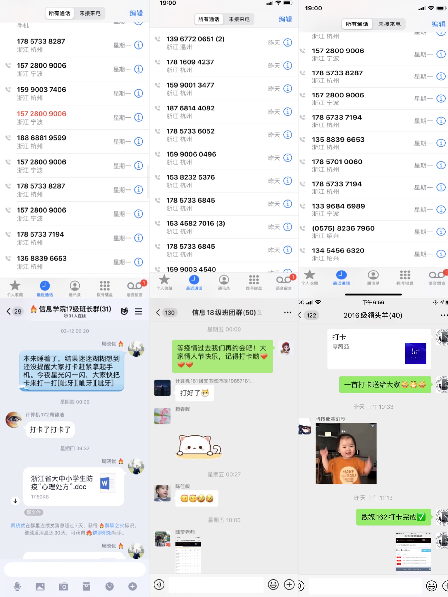 学院在领导小组的带领下,无论是学工线的辅导员们和班主任们,还是行政教学办公室的老师们,已经记不清打了多少个电话,发起了多少次视频,整理了多少条信息,报送了多少组数据,回复了多少个学生提问,每天变着花样提醒同学们打卡,他们付出了比在办公室还要更多的时间,随时待命,随时工作,只为那一句“老师,我很好,放心吧”。