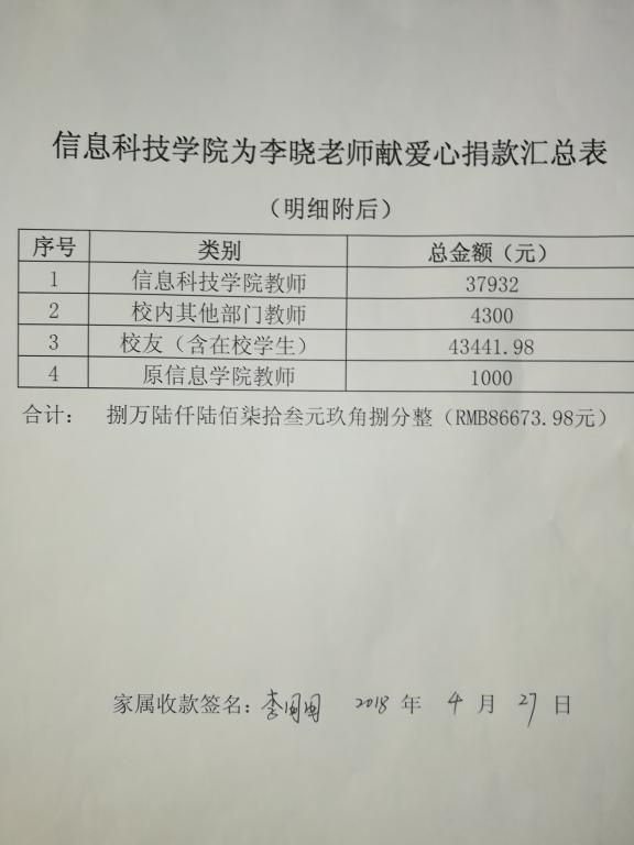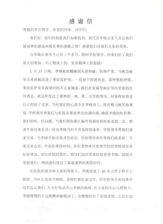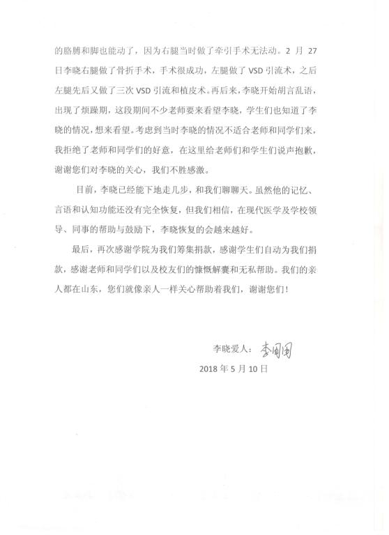 伟德BETVLCTOR1946电子商务教研室李晓老师于2018年1月27日外出时不幸被钢架结构顶棚砸中,导致严重受伤,一直在医院救治。考虑到李晓老师家庭的实际困难,学院分工会于4月10日发起了面向学院教师的捐款倡议书,期间不仅得到了学院教师(含原在信息学院工作的教师)的积极响应、也得到了学校部分兄弟学院教师、在校学生、毕业校友及学院教师朋友的积极响应,共计收到爱心捐款86673.98元,并于4月27日将爱心捐款送到家属手中。近日,学院收到其家属寄来的感谢信,深切感谢学校、学院、同学们给予的关怀和爱心捐款。借此机会,学院分工会也对支持本次捐款工作的所有老师、同学、校友表示衷心的感谢。