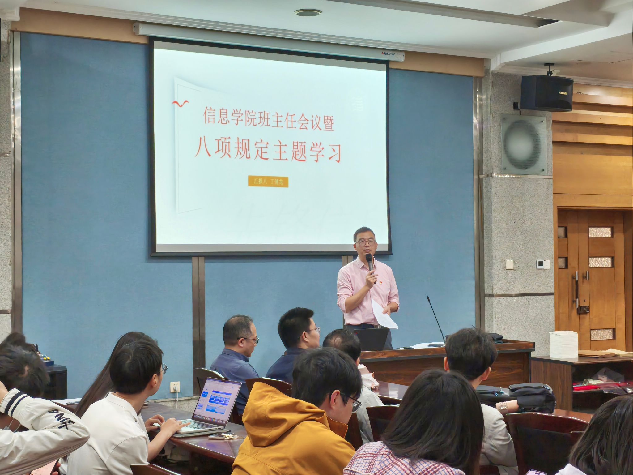 2025 年 4 月 22 日下午1点10分,信息学院在 B2教学楼一楼党员之家召开了班主任会议暨八项规定主题学习活动。本次会议由学院丁健龙副院长主持,信息学院全体班主任、辅导员及研究生指导老师共同参加。