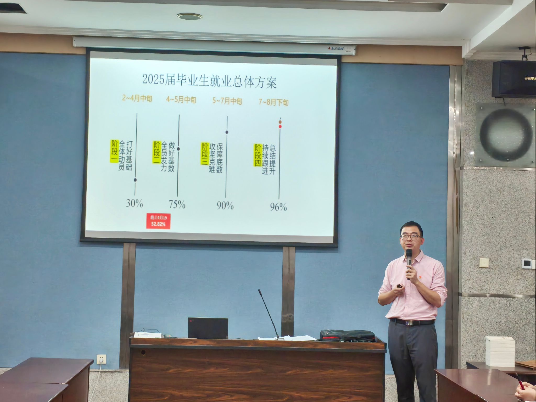 在会议的工作部署环节,丁院长展示了 2025 届毕业生的各项数据,涵盖就业、考研、竞赛等多个方面。基于这些数据,丁院长对学生未来发展的相关指标提出了明确要求和建设性建议。他鼓励班主任积极引导学生做好职业规划,提高就业竞争力;支持有能力的学生投身考研深造,提升学院的考研升学率;同时,加大对学生参与学科竞赛的指导力度,争取在各类竞赛中取得优异成绩。