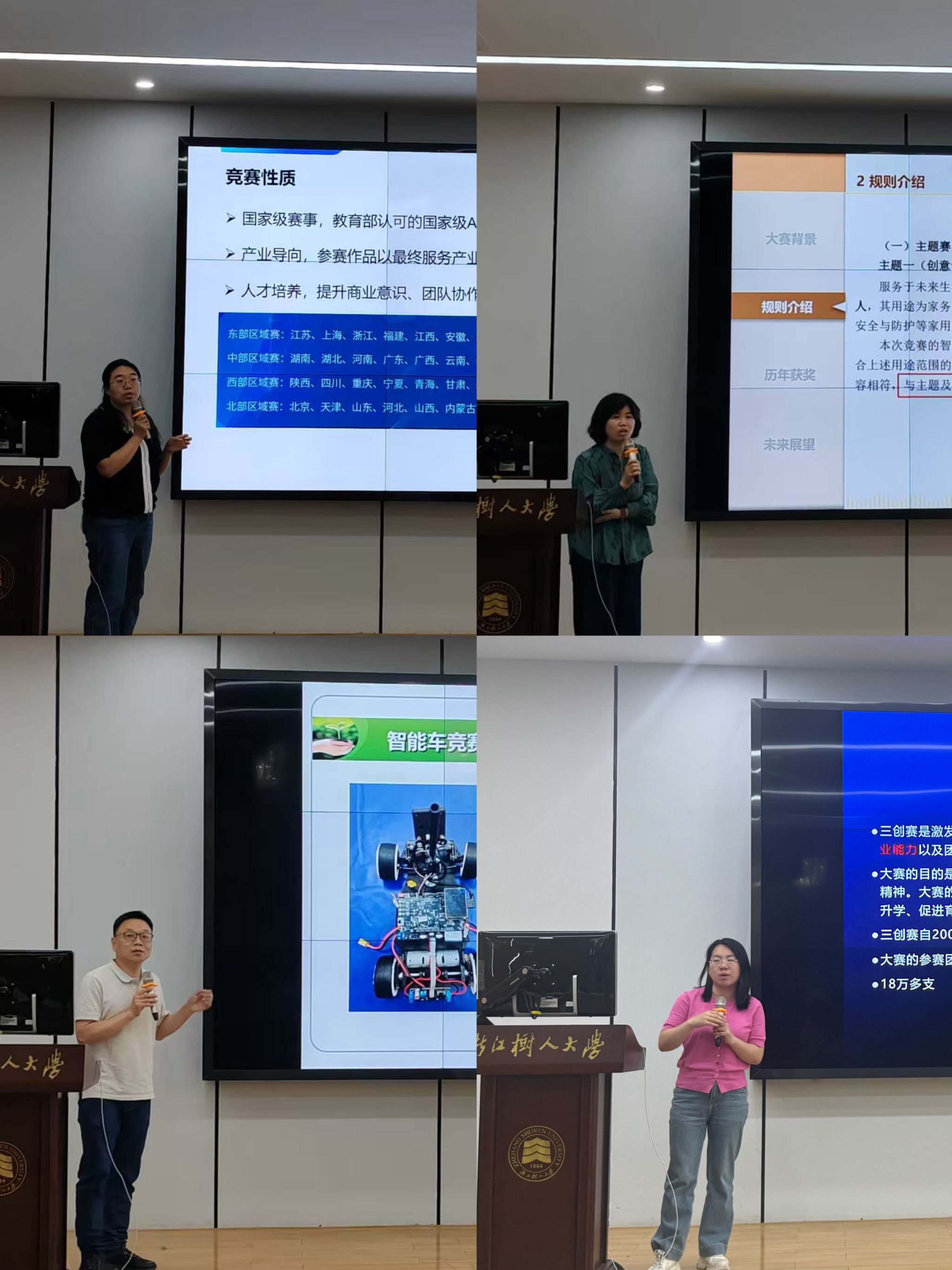 会议最后环节为伟德BETVLCTOR1946重点赛事介绍。吕晓雯、张瑞、吴建锋、吕晓敏四位老师,分别对中国大学生服务外包创新创业大赛、中国高校智能机器人创意大赛、全国大学生智能汽车竞赛以及全国大学生电子商务 “创新、创意及创业” 挑战赛等四项赛事进行了详尽阐述。从赛事背景起源、赛事性质定位、赛事规则细节到赛事成果成效,四位老师进行了细致解读,并结合本校队伍的参赛实践经历,勉励学生们坚定信心,充分发挥个人特长,踊跃参与竞赛,借助竞赛平台全方位提升自身综合竞争力。