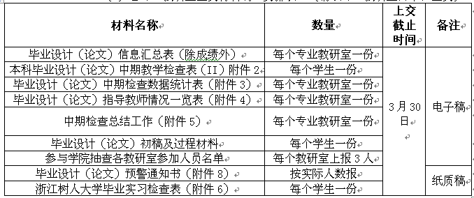 各专业教研室将学生的毕业设计(论文)初稿及过程材料及附件2、3、4、5的电子稿于3月30日(周五)前发院办李志英处。