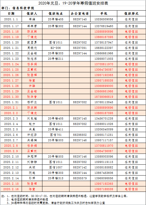 各位老师好,根据校网“关于2020年元旦放假、2019-2020学年寒假轮休安排的通知”,元旦放假时间:2020年1月1日(周三),放假1天。 寒假轮休安排:2020年1月17日起行政人员开始轮休,2月17日教职工上班。放假期间根据上级要求和学校实际,学院安排人员在岗值班和电话值班,值班时间为8:30-17:00。按照学院全体教师轮流值班顺序表及学校的要求,学院在岗、电话值班安排表如下,请值班人员务必尽职尽责,严格落实值班岗位责任制,确保广大师生度过一个欢乐、祥和的节日假期。