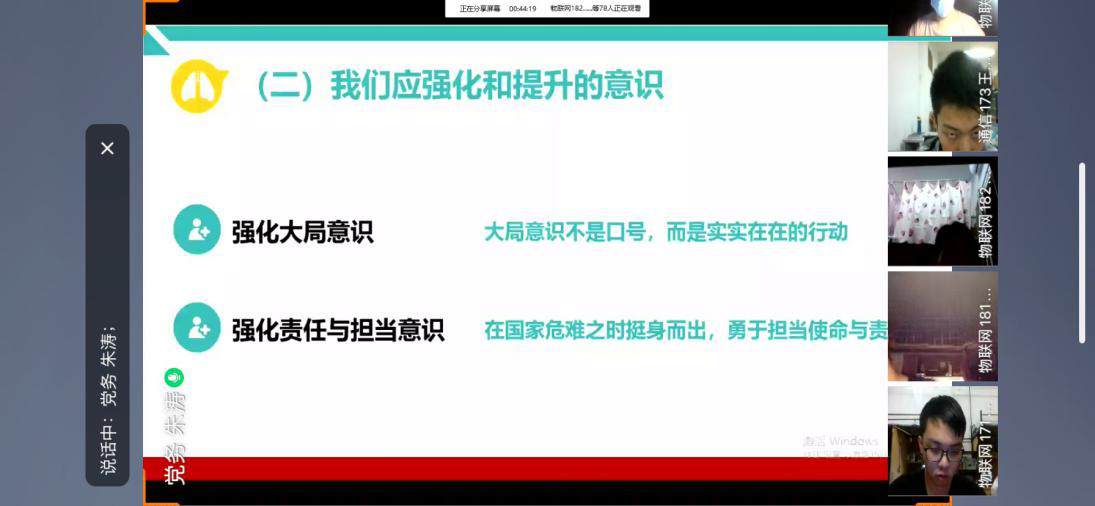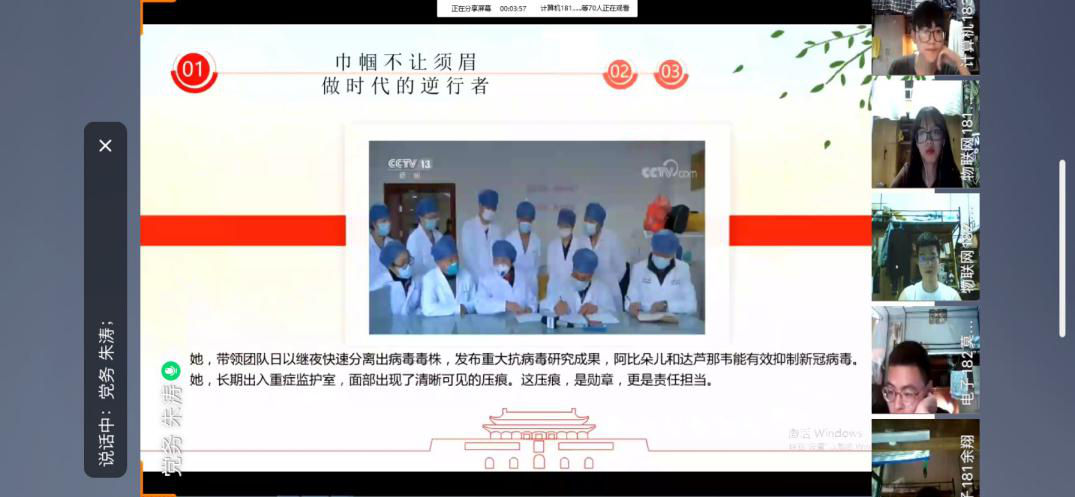 本次党校向学员们展示多个学院的老师制作的微党课视频。分别是伟德BETVLCTOR1946蒋维老师的《不同的岗位,同样的担当》,城建学院赵欣老师的《奋斗有我,筑梦中国》以及树兰国际医学院葛玉花老师的《医者仁心,牢记使命担当》等优秀微党课。在此次党课中各位老师向学员们介绍了在疫情中不畏艰苦、不畏牺牲的逆行者——医护人员,熬夜开发树大打卡系统的丁健龙老师,为消毒产品腾出生产线、电商助农的树大学姐王一爽,以及面对疫情快速更改教学模式的各位老师。无一不展现出青年一代是有理想、有担当的一代。