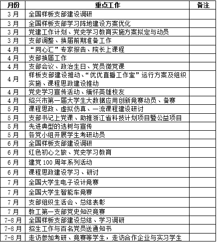 根据学院2021年度党建工作计划安排,支部在学期初就制定伟德BETVLCTOR1946教工第一支部2020-2021学年(二)党建工作计划,如表1所示。