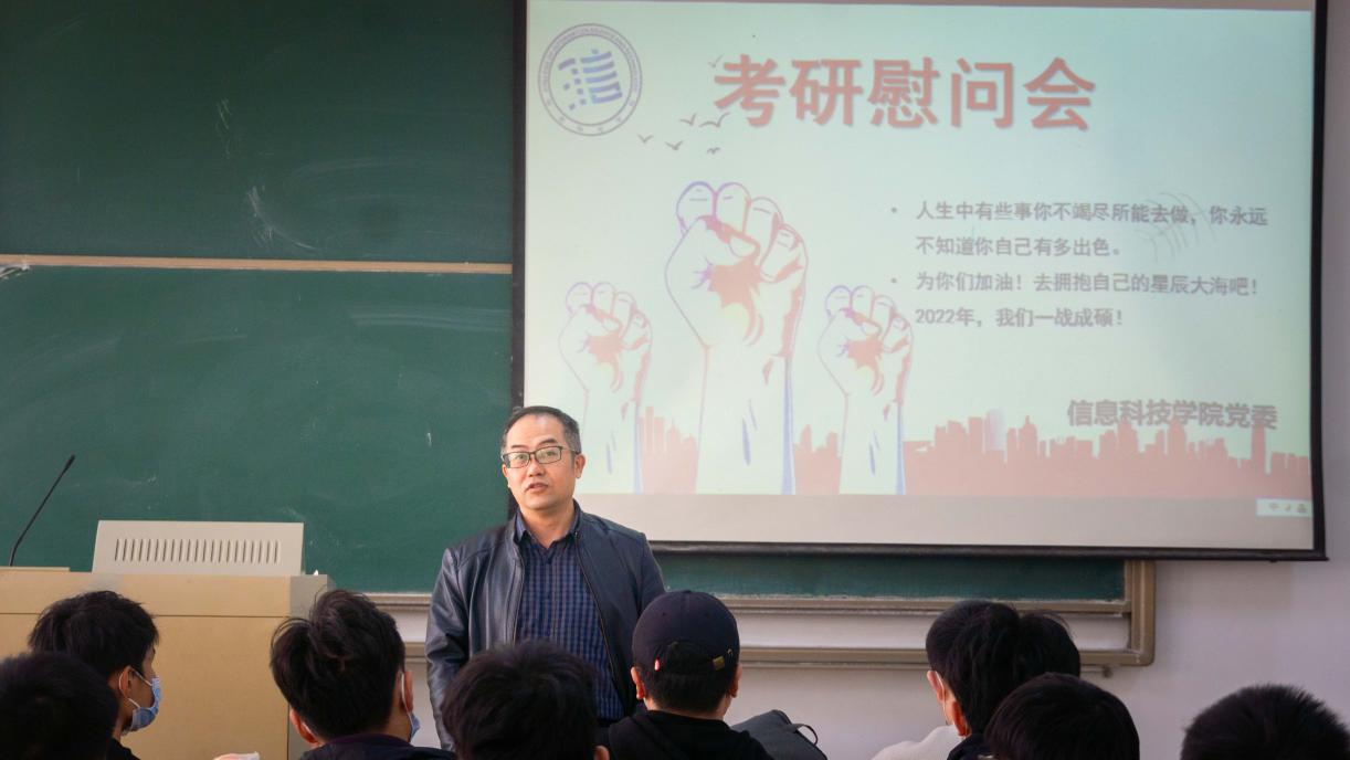 张登辉副院长为考研学生送上祝福,他肯定了同学们一年以来的坚持和努力,并希望大家在考研中调整好心态,多多交流互相帮助,学院也会做好保障工作,及时帮助同学们解决备考中遇到的问题。最后鼓励大家在这个阶段不要松懈,拼尽全力直到最后一刻。