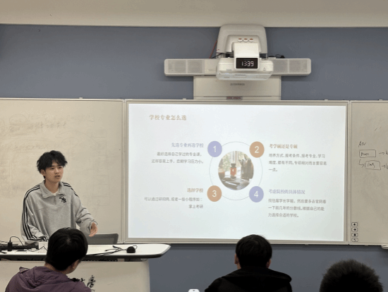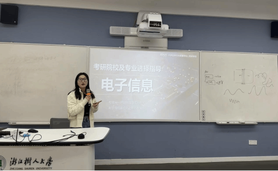 最后,择校专业的资深教师针对电子信息类专业,从计划招生数据、择校四步法(锚定专业、圈定院校、缩小范围、确定目标)分享了择校的相关技巧,从电子信息类各个专业的研究方向及就业方向、历年分数、不同专业的考试内容、招生数据等方面展开讲解了确定考研院校及专业过程中的注意事项。讲座过程中与学生进行了积极互动。