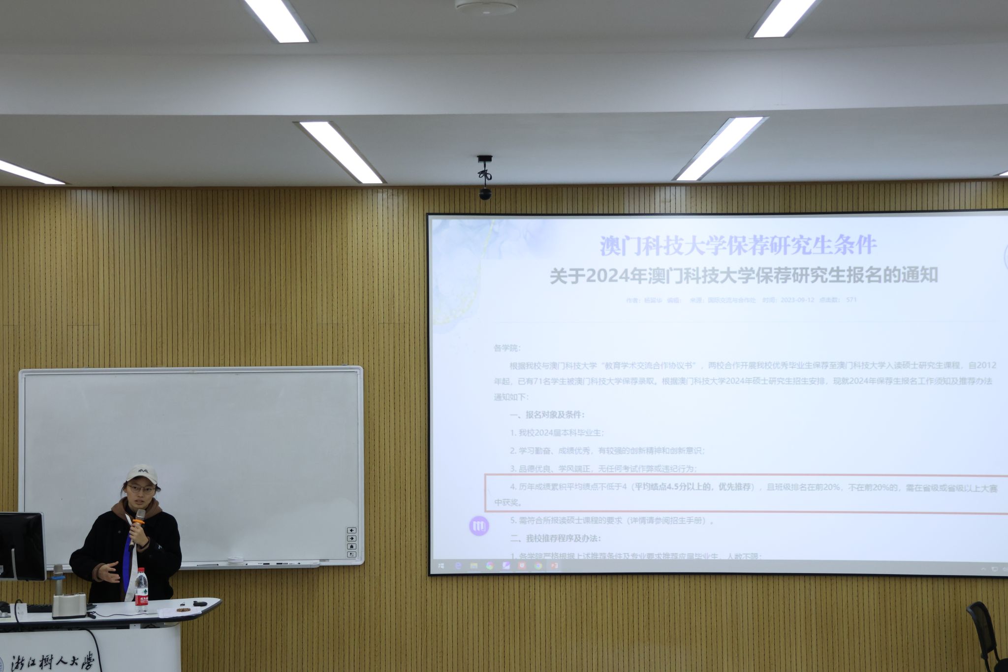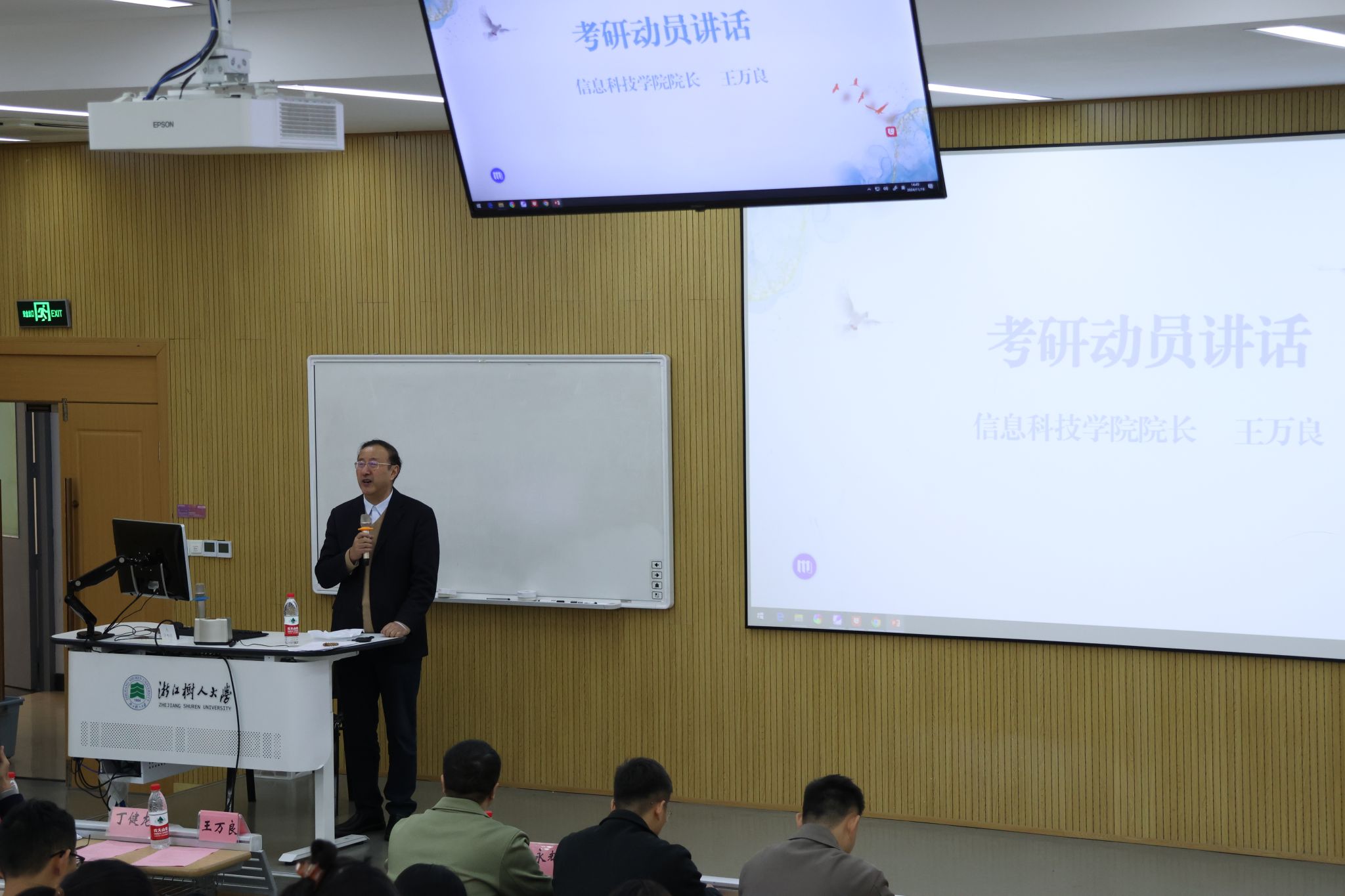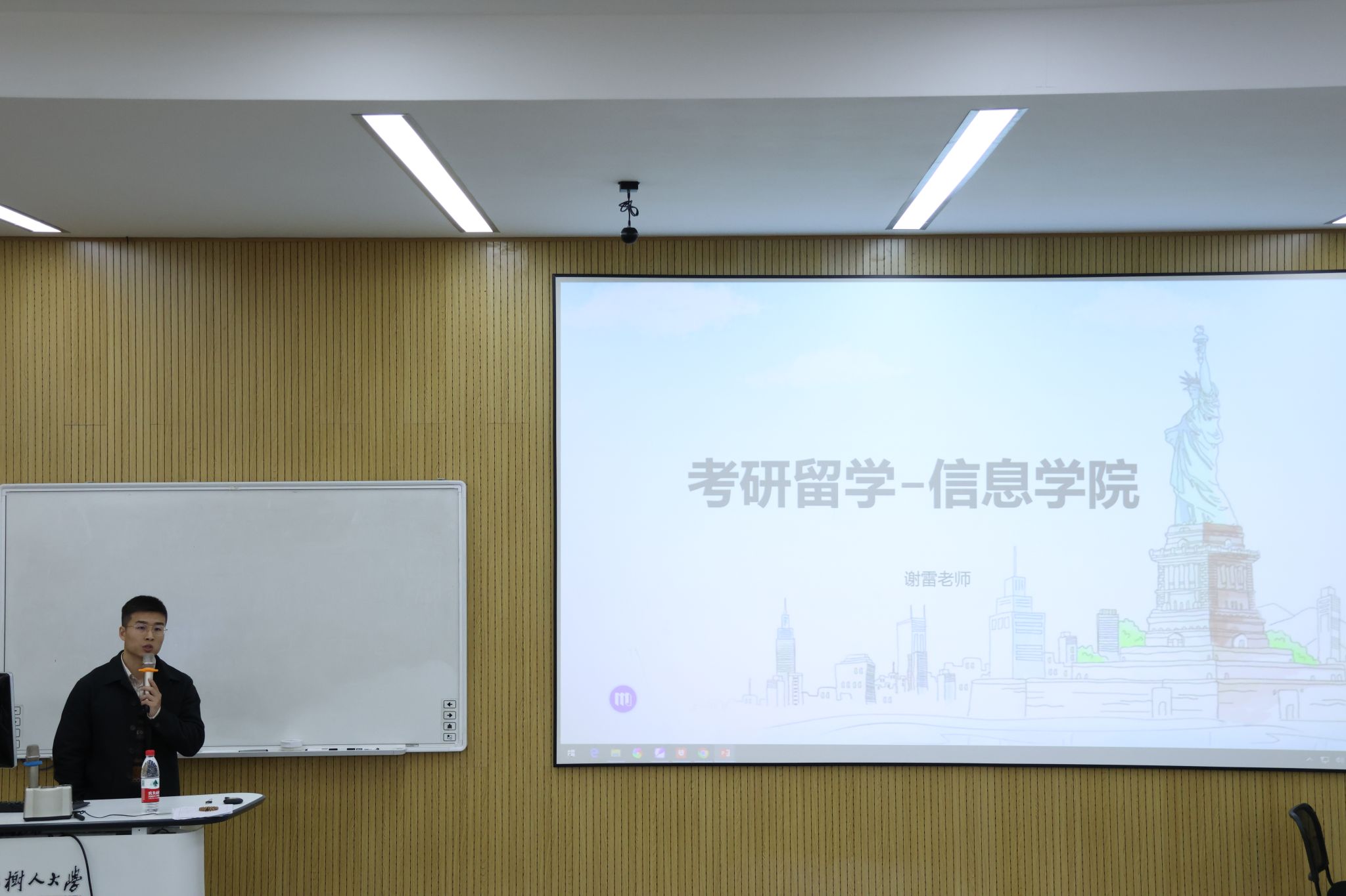 王万良分析了当前的就业与考研形势,结合自身经历,鼓励同学们结合自身实际情况,积极备考,不断提高自己,增强自身的综合能力。丁健龙从我院历年考研、留学情况入手,介绍了学院在申硕以及联合培养研究生方面的工作,勉励同学们要更进一步,珍惜学习时光,实现人生价值。刘力赫老师对学校本硕项目、保荐生条件及要求进行了解读,使学生能够充分了解学校学院对于升学的相关支持。