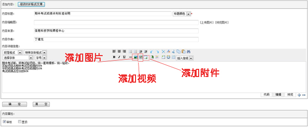通过“内容管理”-》在左侧选择相应的栏目,点击后,选择,右侧下方的“添加”按钮,弹出图6的添加界面。