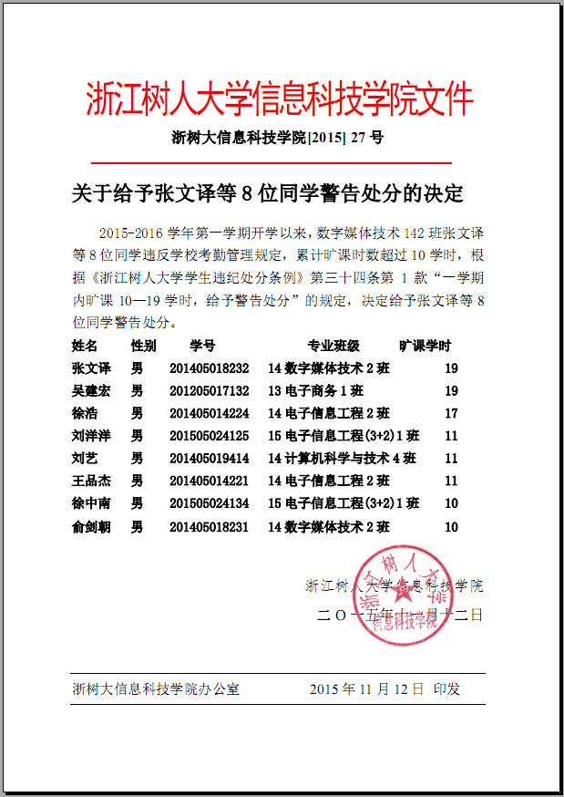 上一条:2015年28号 关于给予鲁汪旺等15位同学警告处分的决定